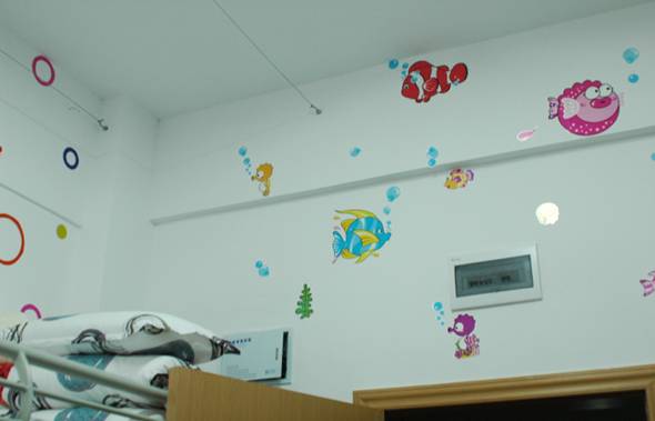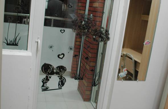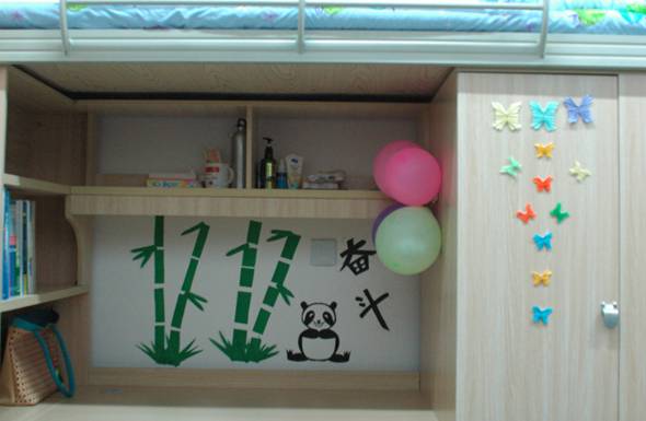 简短的活动开幕式结束后,评审团依次来到2013级同学所在的4、5号宿舍楼进行参观。推开门,一间间干净整洁的寝室出现在眼前。许多寝室都做了精美的布置,从门到墙,写字台到柜子,甚至阳台、窗户,都有同学们独具匠心的各种装扮——偶像海报、精致墙贴、励志文字、剪纸、折纸……。更有一些寝室还特意制作了代表自身特色的室服。