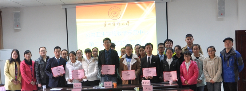 经过2个小时的激烈的角逐,根据决赛现场评审与答辩综合成绩和评委评议意见。食品卫生与营养学专业2013级方海英、周群兰、任会飘同学设计作品“白酒中甲醇检测笔的研制”荣获一等奖;卫生检验与检疫专业2012、2013级陈圆圆、沈文婕、朱海建同学设计作品“贵阳市管网末梢水中主要氯化消毒副产物的含量及不同煮沸时间对其影响的研究”,预防医学专业2011级梁秋果、全科医学专业2013级武雅楠、临床医学2013级文赛、医学实验技术2014级肖鑫、李欣芯同学设计作品“贵阳市南明河流域居民区周围不同生境蚊类多样性调查”荣获二等奖;预防医学专业2013级梁月辉、郑涛同学设计作品“pH计法间接检测牛奶中抗生素的研究”,卫生检验与检疫专业2013级周光云、黄瑶、瞿广胜同学设计作品“贵安新区大学城员工饮用桶装水安全风险的评估”,卫生检验与检疫专业2014级黄一铭、闫维维、程远萍、潘丽忠、文冰阳同学设计作品“贵州省农村垃圾处理现况调查及存在问题初探”荣获三等奖;同时,根据初赛班级参与率以及获奖情况,评选出组织奖2个,分别为食品卫生与营养学专业2013级和卫生检验与检疫专业2013级。公司领导和各位评委专家为获奖团队颁发奖状、奖金,并与获奖选手合影。