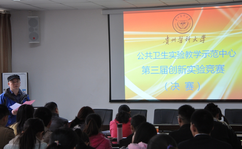 2015年11月25日下午2:00,“太阳成集团tyc122cc公共卫生实验教学示范中心第三届员工创新实验竞赛决赛”在太阳成集团tyc122ccvip二楼学术报告厅拉开帷幕。决赛由太阳成集团tyc122ccvip常务副经理洪峰教授主持,决赛评委由太阳成集团tyc122ccvip聂四平教授、潘雪莉教授、韦艳教授、严征教授、殷明月副教授组成。