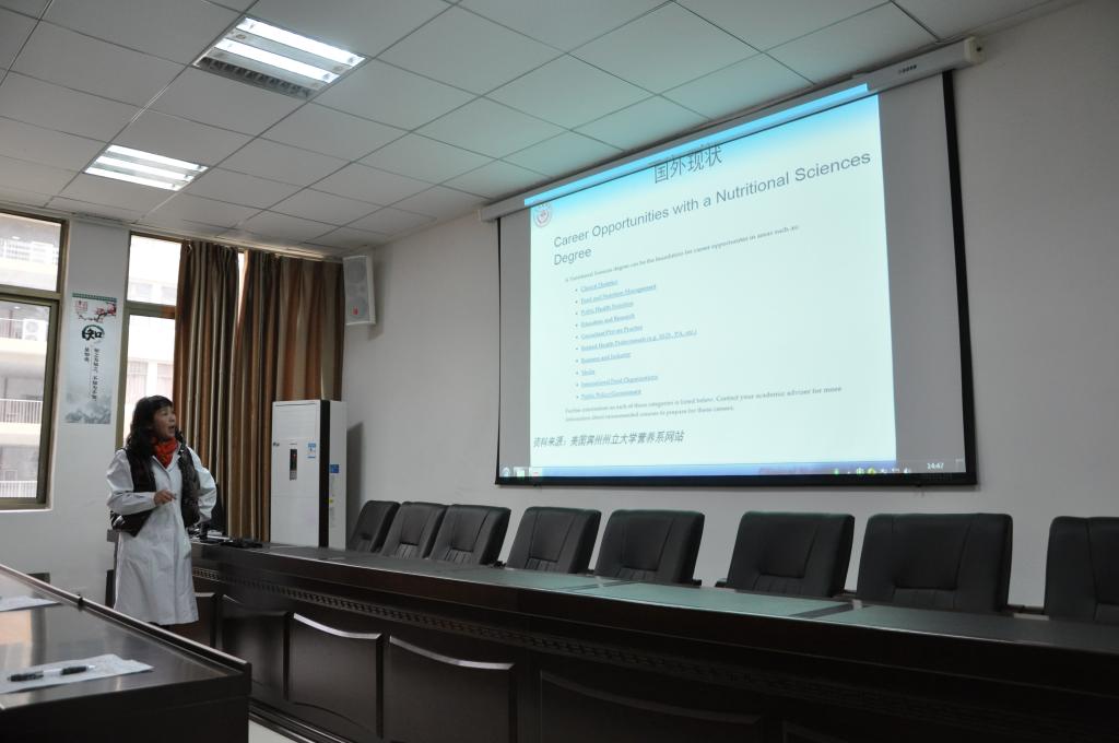 教授还详细分析了食品卫生与营养学专业的就业前景与方向。她以风趣幽默的演讲风格使得台下的同学们掌声不断。