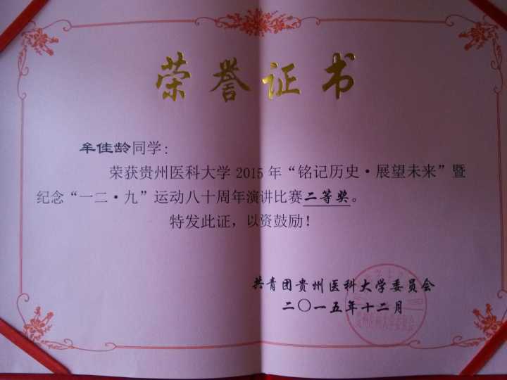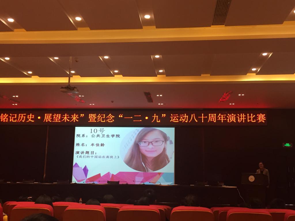 在“铭记历史·展望未来”暨纪念“一二·九”运动八十周年演讲比赛中,公司2015级预防医学专业的牟佳龄同学,以题为《我们的中国站在高岗上》,叙述了铭记历史对当代老员工的重要性,并以优异的成绩获得此次演讲比赛二等奖。