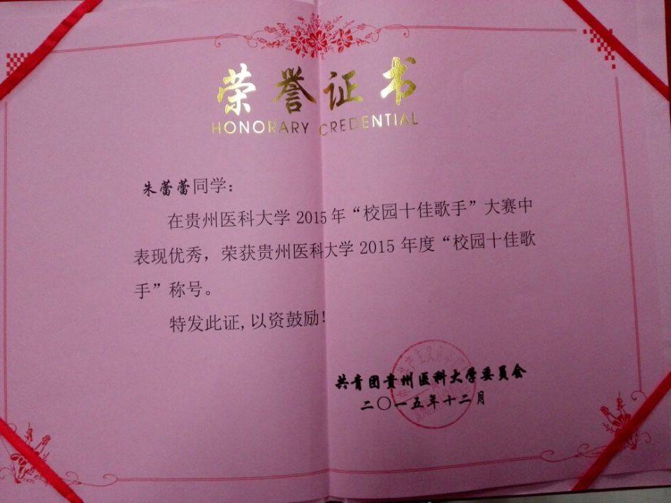 在“校园十佳歌手”的比赛中,公司2015级预防医学专业的朱蕾蕾同学经过海选、复赛中的激烈角逐,最终以一首委婉动听的《魔鬼中的天使》获得“校园十佳歌手”荣誉称号。