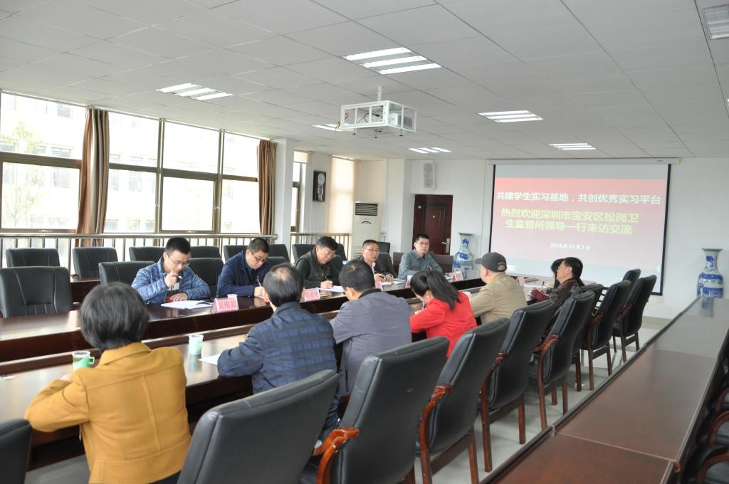 为加强实习基地与公司之间的联系、交流和沟通,11月3日上午深圳市宝安区松岗卫生监督所(预防保健所)袁青所长一行5人到太阳成集团tyc122ccvip进行走访与交流。交流会在南校区太阳成集团tyc122ccvip二楼会议室举行,由太阳成集团tyc122ccvip经理洪峰主持。党委副书记何江、综合办公室主任张强、教学科研管理科副科长张燕、员工科科长刘亮和各教研室负责人共15人参加了交流会。