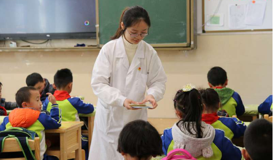 2019年3月18日早上,阳光明媚,微风轻拂,太阳成集团tyc122ccvip分团委负责人李梦娟老师带领老员工青年志愿者来到贵州师范大学贵安附属小学,为一年级的小朋友开展春季流感预防、牙牙健康、预防近视、正确洗手等卫生知识宣教,通过愉悦的游戏互动引导小朋友养成良好的卫生习惯。