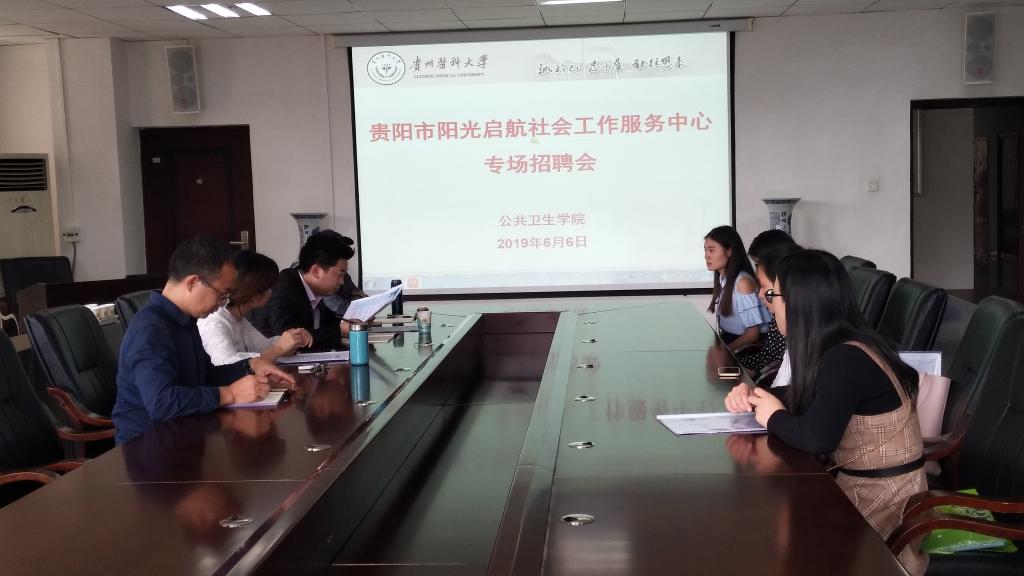 6月6日上午,太阳成集团tyc122ccvip在博雅楼二楼会议室召开“贵阳市阳光启航社会工作服务中心专场招聘会”。公司党委书记杨光红、党委副书记何江、副处级组织员刘亮、员工科全体老师以及2019届预防医学、食品卫生与营养学、卫生检验与检疫专业毕业生参加。