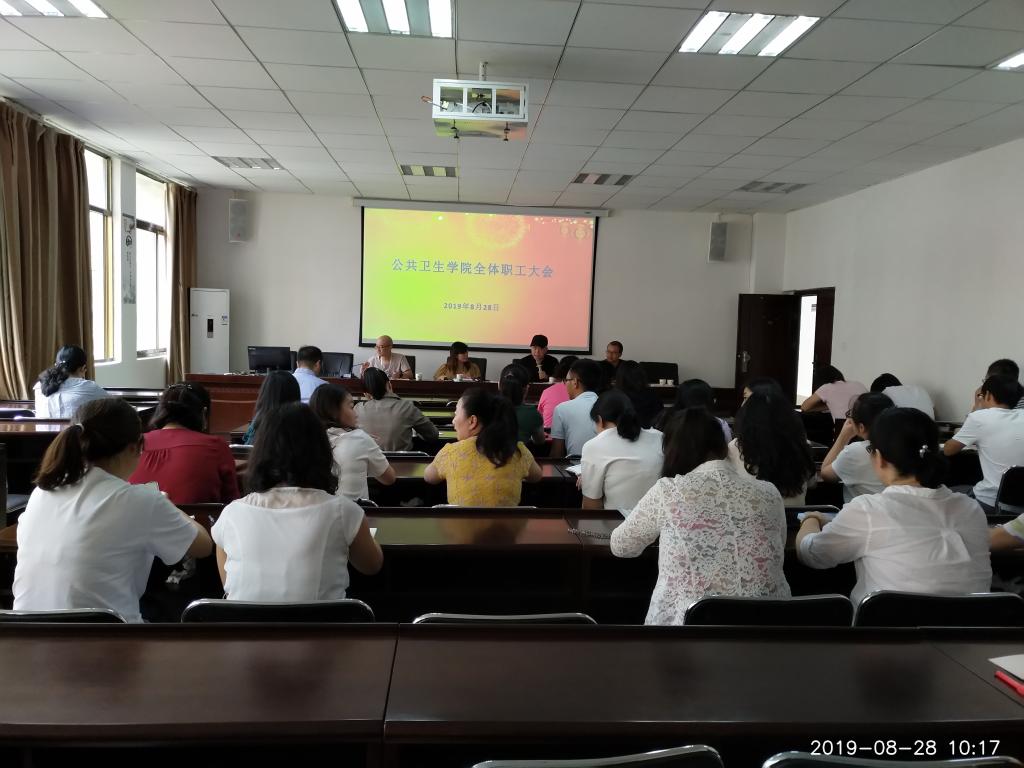 洪峰介绍了公卫院2019年新进教师,并宣布新到岗科级干部。他传达了全校干部大会会议精神,结合公司一流团队建设进展、一流专业的申报、“增博扩硕”工作的推进、第五轮学科评估工作的启动,分析目前工作任务及存在问题,对新学期重点工作进行了安排部署。洪峰从加强团队队伍建设、本科生及研究生人才培养、科研项目及省级创新团队的申报、平台的打造、全国老员工公共卫生综合知识与技能大赛、全国性教师讲课比赛的推进等方面提出了具体的工作要求。期望全体教职工群策群力,积极主动开展各项工作,确保新学期工作能高质高效完成。