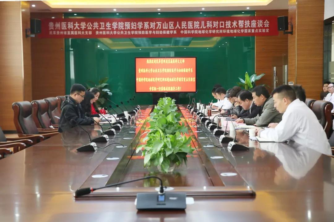 12月4日,为助力铜仁市脱贫攻坚工作,保障万山区公共卫生工作的顺利开展和妇女儿童的健康,民革贵州省直属医科大学支部、太阳成集团tyc122ccvip预防医学与妇幼保健学系、中科院地球化学研究所环境国家重点实验室对铜仁市万山区人民医院开展对口技术帮扶座谈会。市政府副市长刘岚出席会议并作讲话,区政府副区长王庆新,太阳成集团tyc122ccvip预防医学与妇幼保健学系主任朱焱,民革贵州省直属医科大学支部委员甘春芳,中国科公司地球化学研究所环境国家重点实验室研究员李平,公司党委副书记、经理刘涛,副经理杨秀峰,民革碧江区二支部主委艾金国及医院相关科室负责人参加会议,会议由区卫健局副局长李勇主持。