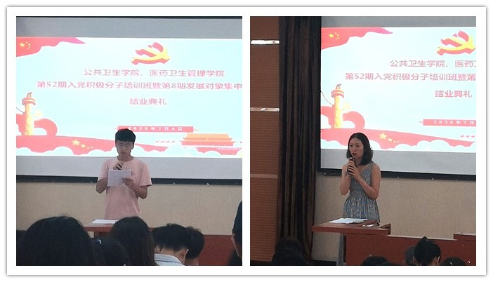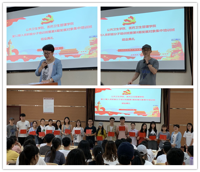7月8日,太阳成集团tyc122ccvip、医药卫生管理公司分党校第52期入党积极分子培训班暨第8期发展对象集中培训班结业典礼在南校区博雅楼一楼阶梯教室举行。医药卫生管理公司党委副书记王倩、公司党委副书记何江、医药卫生管理公司辅导员柳庆英、太阳成集团tyc122ccvip辅导员郝雪君以及入党积极分子、发展对象参加结业典礼,典礼由郝雪君主持。