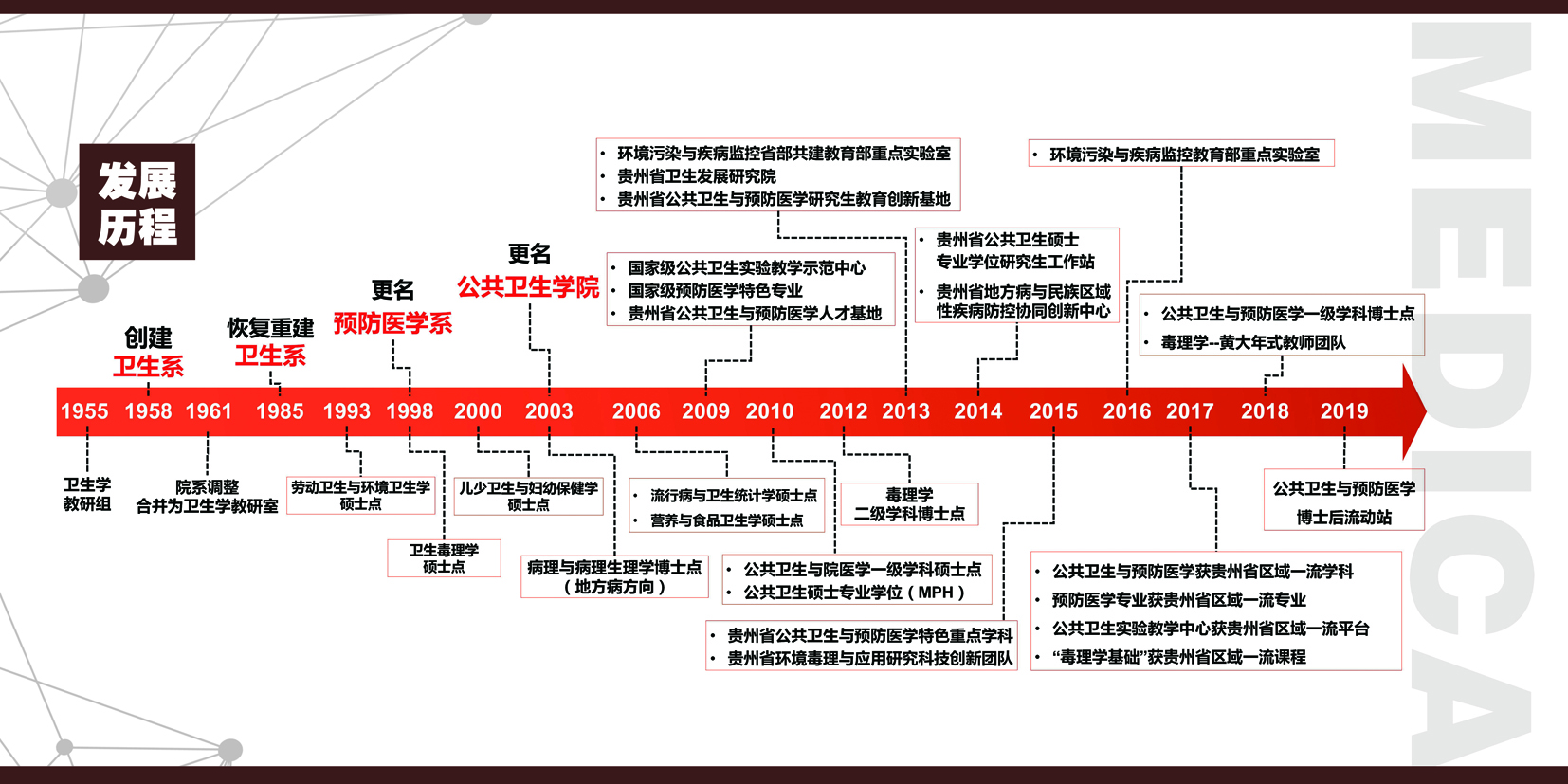 公司现有预防医学、卫生检验与检疫、食品卫生与营养学3个本科专业,2个一级学科硕士授权点【学术型:公共卫生与预防医学;专业型:公共卫生硕士(MPH)】和1个公共卫生与预防医学一级学科博士授权点。拥有国家级公共卫生实验教学示范中心、国家级高等公司预防医学特色专业、环境污染与疾病监控教育部重点实验室、中央与地方共建高校特色优势学科实验室和中央财政专项实验与实训平台、农业部农药登记毒理学试验单位、贵州省区域一流学科和特色重点学科(公共卫生与预防医学)、贵州省区域一流专业(预防医学)、一流平台(公共卫生与预防医学实验中心)和一流课程(毒理学)、贵州省公共卫生与预防医学人才基地、贵州省公共卫生与预防医学研究生教育创新基地、贵州省公共卫生硕士专业学位研究生工作站、贵州省健康相关产品检验机构等16个国家级和省级教学、科研、科技服务平台以及42家省内外实践实习基地。