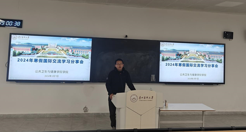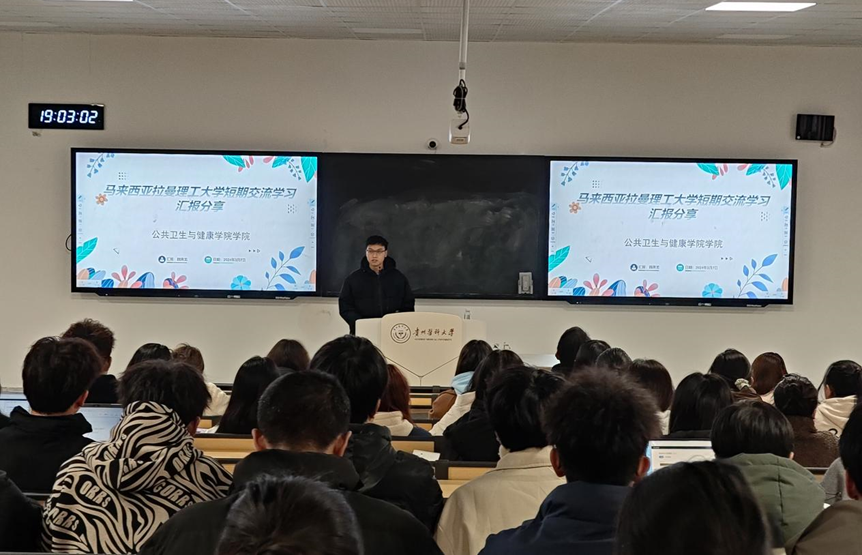 近日,太阳成集团tyc122ccvip在公卫组团R101教室开展2024年寒假短期国际交流项目分享会,活动由员工科副科长原琦老师主持。2023级食品卫生与营养专业魏降龙分享参加马来西亚拉曼理工大学短期交流学习的经历与收获。