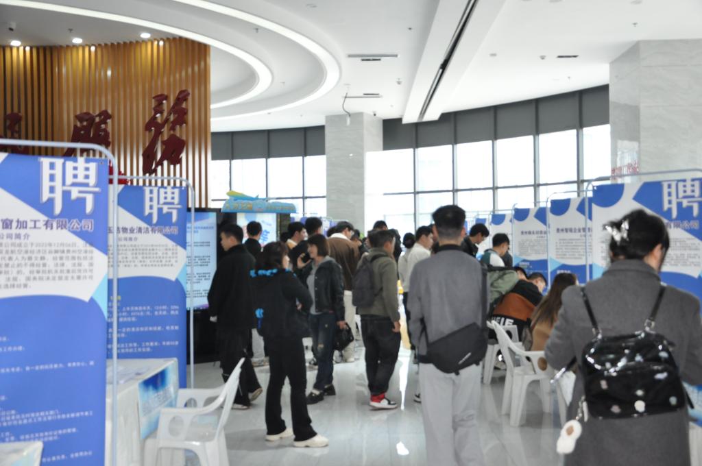 座谈会结束后,毕业生参加了“黔聚人才·筑梦双龙”2024年贵州双龙航空港经济区“春风行动”综合性招聘会。此次招聘会汇集了贵州一树药业股份有限公司、贵阳豆品乐食品有限公司、贵州金玖生物技术有限公司、贵州润生制药有限公司、贵阳兆明羊城西饼食品有限公司等40家企业。同学们结合自身专业背景与兴趣爱好与企业展开交流并投递简历。