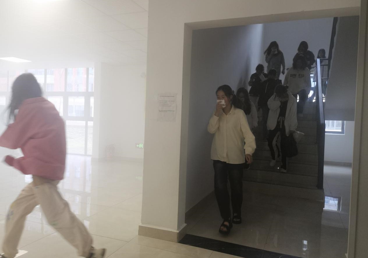 场景1:教室疏散演练。某教室发生火情,上课教师迅速组织员工使用湿毛巾捂住口鼻、按照消防疏散动作要领,从楼内安全通道迅速有序撤离至楼外安全区域并立即拨校园微型消防站报警电话,楼栋安保人员迅速到教室各楼层通知并协助楼栋内其他教室的师生迅速有序撤离。