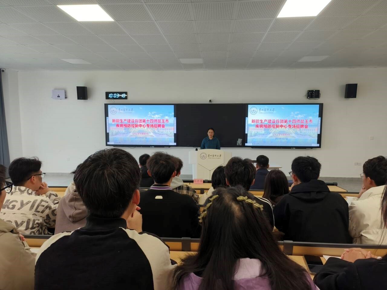 会上,张守萍首先播放了昆玉市及昆玉市疾控中心的宣传片,并从昆玉市市情、昆玉市疾病预防控制中心概况和发展规划、人才需求、招聘流程、福利待遇、职业发展等方面向参会员工进行了详细介绍,欢迎广大青年奔赴大美新疆,建设祖国西部。在互动环节,张守萍就同学们关注的问题进行了充分交流。招聘现场气氛热烈,同学们纷纷投递个人简历,积极推荐自己。