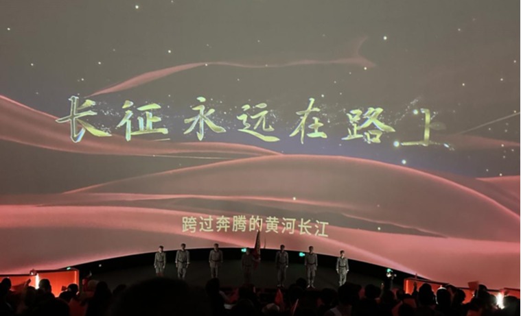 师生党员抵达“红飘带”场馆后,在象征着革命火种的广场前,员工党员代表以《红飘带-长征颂》为题进行了诗歌朗诵,歌颂红军长征的英雄事迹,用坚定而嘹亮的朗诵回顾了红军长征的革命壮举。