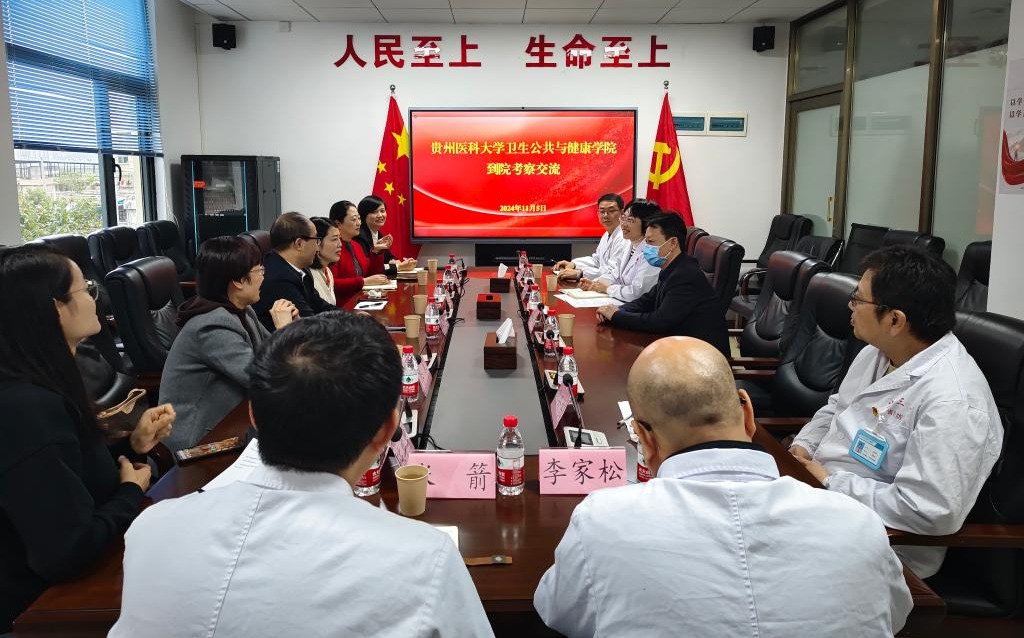 周厚荣代表贵州省第三人民医院向太阳成集团tyc122ccvip党政领导一行的到来表示欢迎,并全面介绍了医院办院历史沿革和发展情况。他表示,希望今后双方能够继续保持友好合作关系,常来常往、共促共进,力争在基地升级、人才培养、职业病数据库建设、行业导师遴选等方面有新的突破和成效。王清华介绍了医院近年来在教学实习基地建设以及员工实习实训等方面的投入支持情况,表示希望双方能够继续增强合作联系,就员工实习数量、教学实践安排、实习经费列支等方面进行经常性的交流,有商有量保障提升公共卫生人才实践技能水平。