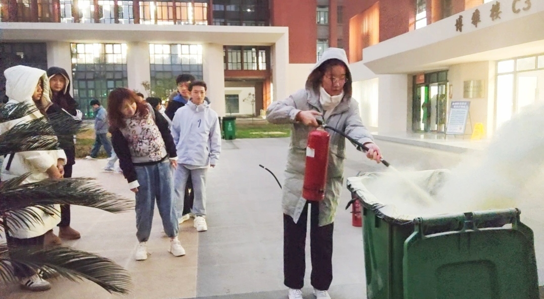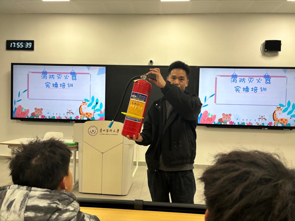 在公卫组团L213教室开展的消防知识培训中,保卫处徐林宣老师向同学们详细介绍了火灾发生时可能面临的情况,包括常见的火源和燃烧物,以及可能导致火灾扩散的因素。提醒同学们在日常生活和学习中加强对身边事、物、人的关注关切,从大一起就培养自我消防安全意识,熟悉和掌握简单的灭火技能,学会灭小火和早处置的基本常识与技能。随后,徐老师为同学们示范讲解如何正确使用灭火器,“记住,使用灭火器时要‘提拔握压’,先提起灭火器,然后拔掉保险销,再握住喷管对准火源根部,按下压把进行喷射。”徐老师一边示范一边讲解,同学们聚精会神地观察着每一个动作细节。
