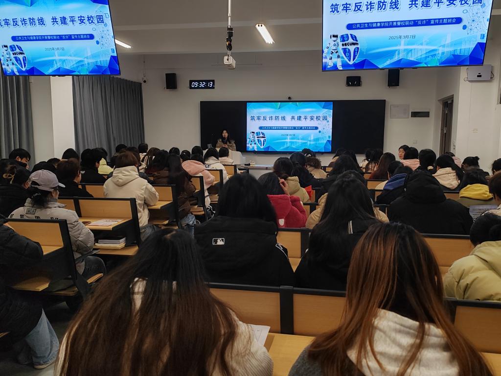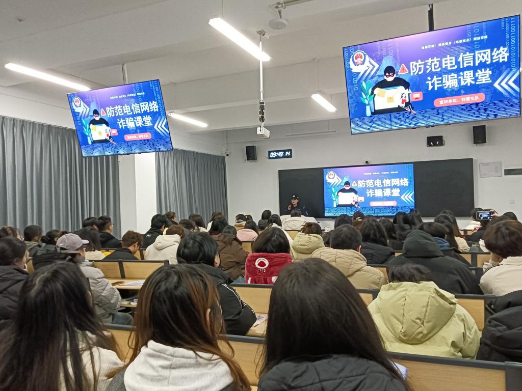 为进一步提高公司员工防范电信网络诈骗的意识和能力,共同营造安全、和谐、文明的校园环境,3月7日,校保卫处联合贵安新区公安局特警支队在云漫湖校区公卫组团C1栋L104教室开展警校联动反诈宣传主题班会。太阳成集团tyc122ccvip员工科副科长原琦、保卫处刘永康、辅导员李德健和100余名在校本科生参加本次班会。