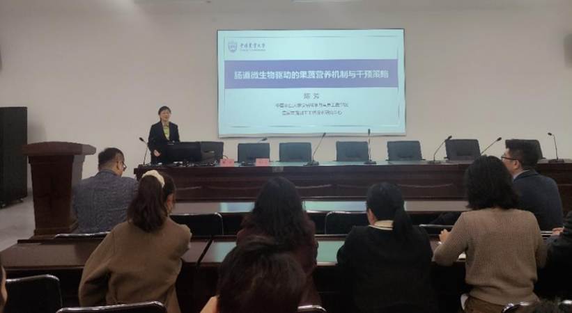 讲座中,陈芳教授结合自身及团队的研究成果,从果蔬功效成分挖掘、肠道微生物调控、慢病干预等多个维度,系统阐释了肠道微生物驱动下的果蔬营养机制。在这一过程中,她提出将现代营养学与精准营养学互补结合的创新思路,强调借助数据与智能驱动,通过多学科交叉融合,探索挖掘果蔬更多潜在功能,为食品健康领域发展提供了新方向。此外,陈芳教授还分享了国家果蔬加工工程技术研究中心人才团队的建设发展经验。结合团队成长历程,她为青年博士的个人职业发展提出切实可行的建议,同时也为公司相关学科的规划与建设提供了极具价值的参考。讲座最后,公司教师积极与陈芳教授展开互动,就专业领域内的问题进行了深入探讨与交流。