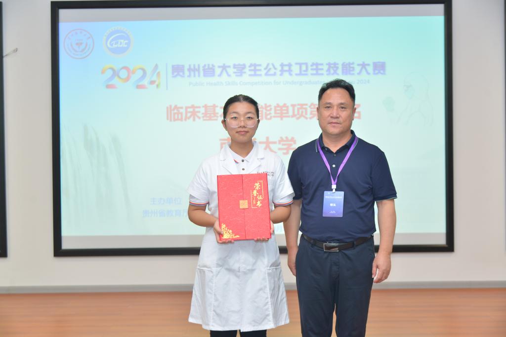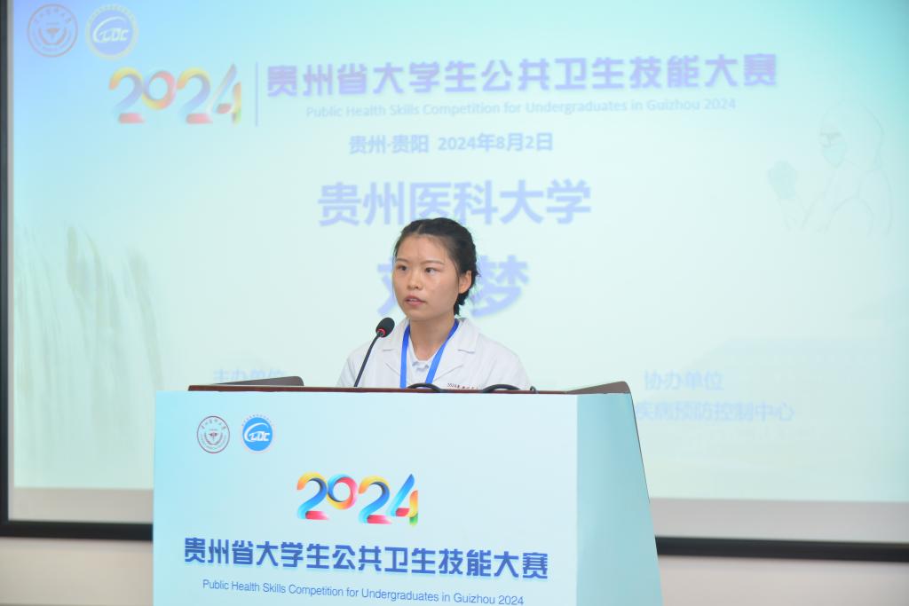 骆奕代表贵州省教育厅向大赛的成功举办表示祝贺,向长期以来关心支持贵州公共卫生教育事业发展的各位领导、专家评委和社会各界人士表示感谢,并希望参赛的同学们保持探索求真的精神、协同合作的精神、创新务实的精神和功成有我的精神,在未来的学习和工作中发光发热,为构建和谐健康的社会贡献自己的一份力量。