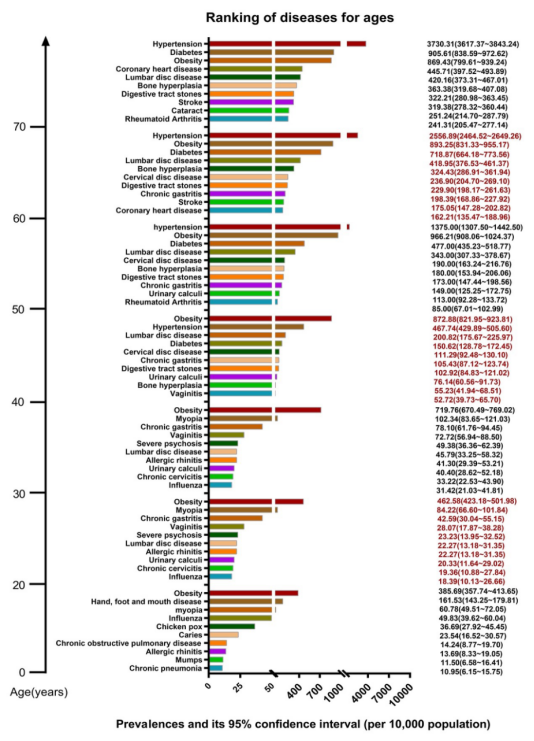 中国贵阳居民疾病的年龄分布特征显示,各年龄组居民的常见疾病差异很大。肥胖和近视在40岁以下的人群中更常见。肥胖、高血压、糖尿病、腰椎间盘疾病的患病率在≥40岁以上人群中更高;除肥胖外,上述疾病的患病率随着年龄的增长而逐渐增高。在老年人群中,除了上述疾病外,冠心病、腰椎间盘疾病、骨质增生已逐渐成为威胁健康的主要疾病。手足口病主要发生在学龄儿童。