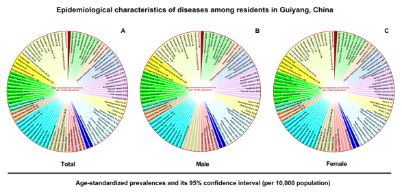 该研究采用多阶段分层整群抽样,通过一项涉及77381名志愿者的横断面研究发现,中国贵阳居民的主要疾病为慢性非传染性疾病,但仍然存在传染病的局部流行,如手足口病。基于自然人群研究结果,贵阳居民的常见慢性非传染性疾病患病率由高到低排序如下:肥胖、高血压、糖尿病、腰椎间盘疾病、慢性胃炎、消化道结石、颈椎间盘疾病、骨质增生、近视和尿道结石。女性排名前三的恶性肿瘤主要是乳腺癌、宫颈癌和子宫内膜癌,而男性常见的恶性肿瘤主要是肺癌、直肠癌和胃癌。