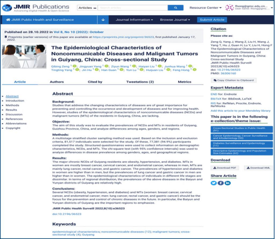 2022年10月28日,公共卫生领域专业期刊《JMIR Public Health and Surveillance》(JCR 1区,IF:14.557)在线发表了公司洪峰教授课题组研究论文“The Epidemiological Characteristics of Noncommunicable Diseases and Malignant Tumors in Guiyang, China: Cross-sectional Study”。