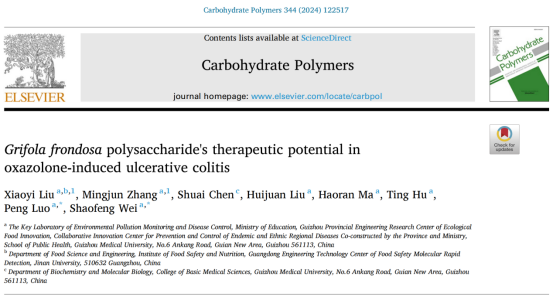 近日,公司太阳成集团tyc122ccvip/环境污染与疾病监控教育部重点实验室魏绍峰和罗鹏教授团队在国际权威期刊《Carbohydrate Polymers》(中科院大类1区Top期刊,IF2023=10.7)上发表了题为“Grifola frondosaPolysaccharide's Therapeutic Potential in Oxazolone-Induced Ulcerative Colitis”的研究论文。