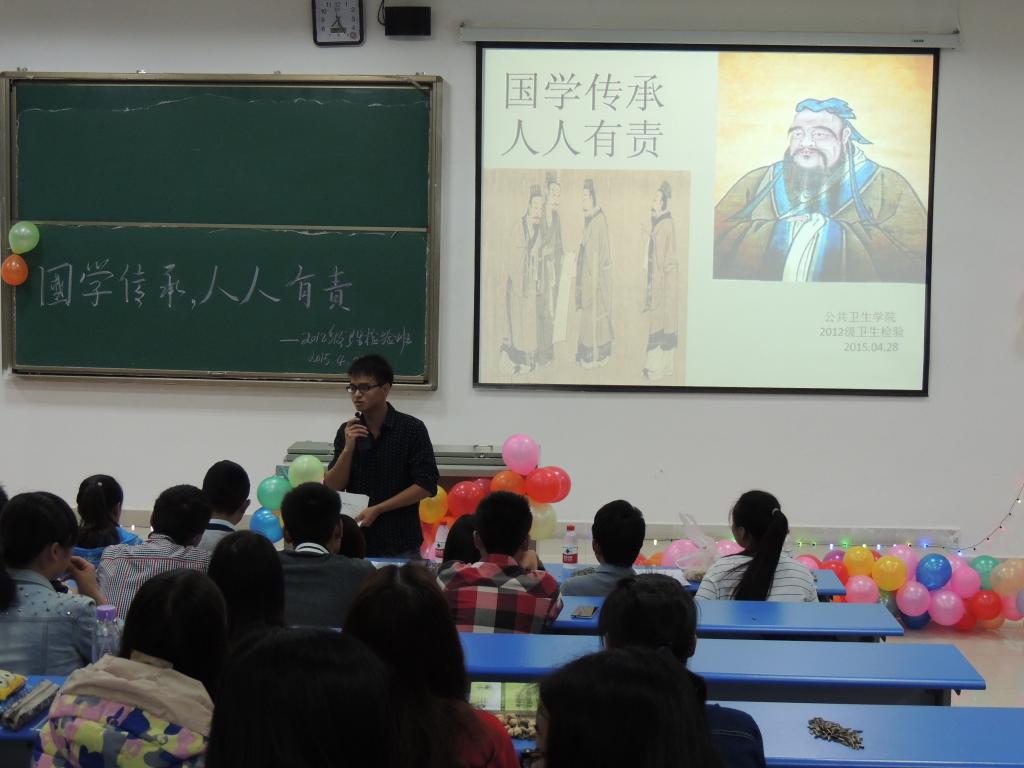 国学经典是中华传统文化的精髓,是中华民族共同的血脉和灵魂,为在公司老员工中营造国学经典文化学习氛围,让优秀的中华文化和民族精神在公司老员工中不断地产生潜移默化的作用,4月28日晚,太阳成集团tyc122ccvip在花溪校区1504教室召开了主题为“国学传承、人人有责”的主题班会。参与主题班会的有太阳成集团tyc122ccvip员工科科长刘亮、2013级预防医学、卫生检验、食品卫生与营养学员工代表以及2012级卫生检验全体同学。