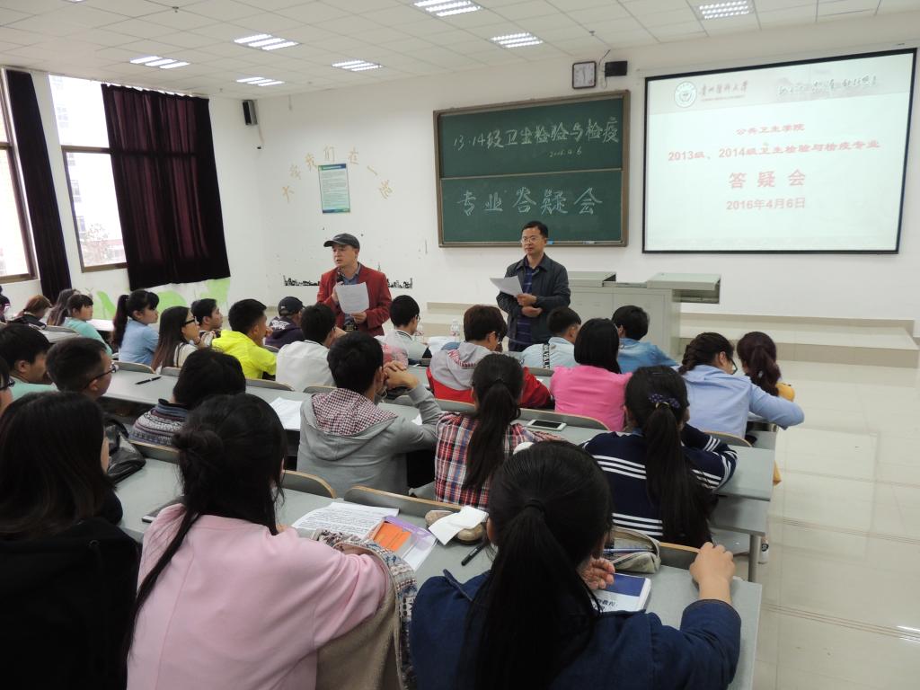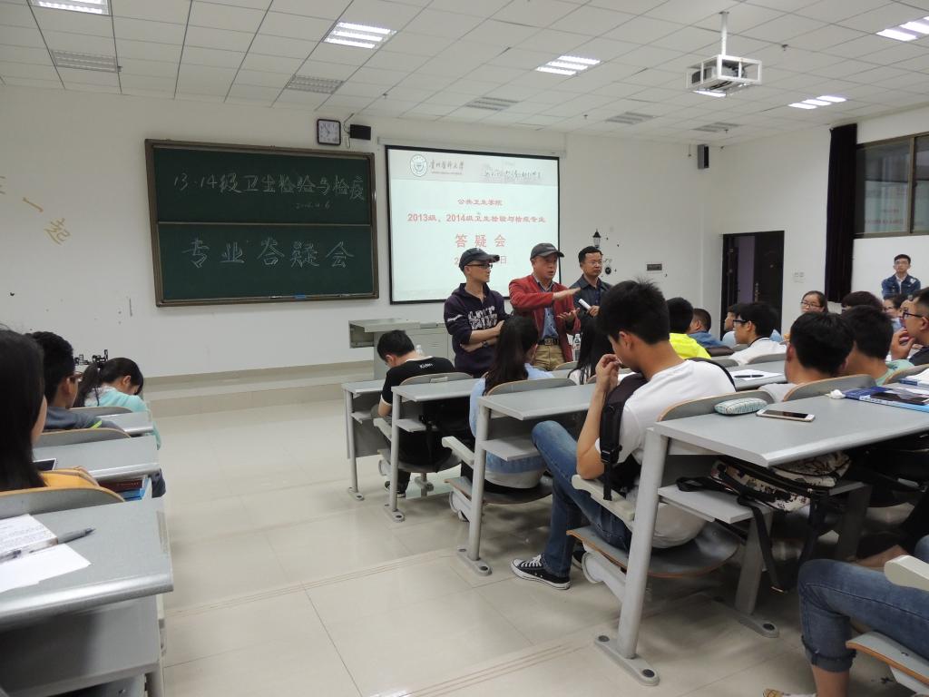 ,太阳成集团tyc122ccvip在花溪校区4404教室召开2013级、2014级卫生检验与检疫专业主题班会。太阳成集团tyc122ccvip常务副经理洪峰、教学科研管理科科长何江、卫生检验与检疫教研室主任胡勇、员工管理科科长刘亮出席班会,为同学们答疑解惑。