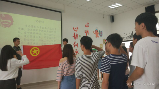 进一步激励广大青年在新历史时期坚定不移永远党走的信念,增强共青团员的光荣感和使命感,充分发挥共青团组织的作用,促进团组织的自身建设,努力成为党的助手和后备军​太阳成集团tyc122ccvip分团委于518日下午在南校区x4504教室隆重举行“不忘初心跟党走”新团员入团宣誓仪式。入团宣誓仪式由​太阳成集团tyc122ccvip分团委负责人柴颖老师主持,​太阳成集团tyc122ccvip何江副书记周洪媛老师、孙静老师、各班团支部书记16新团员参加了此次入团宣誓仪式
