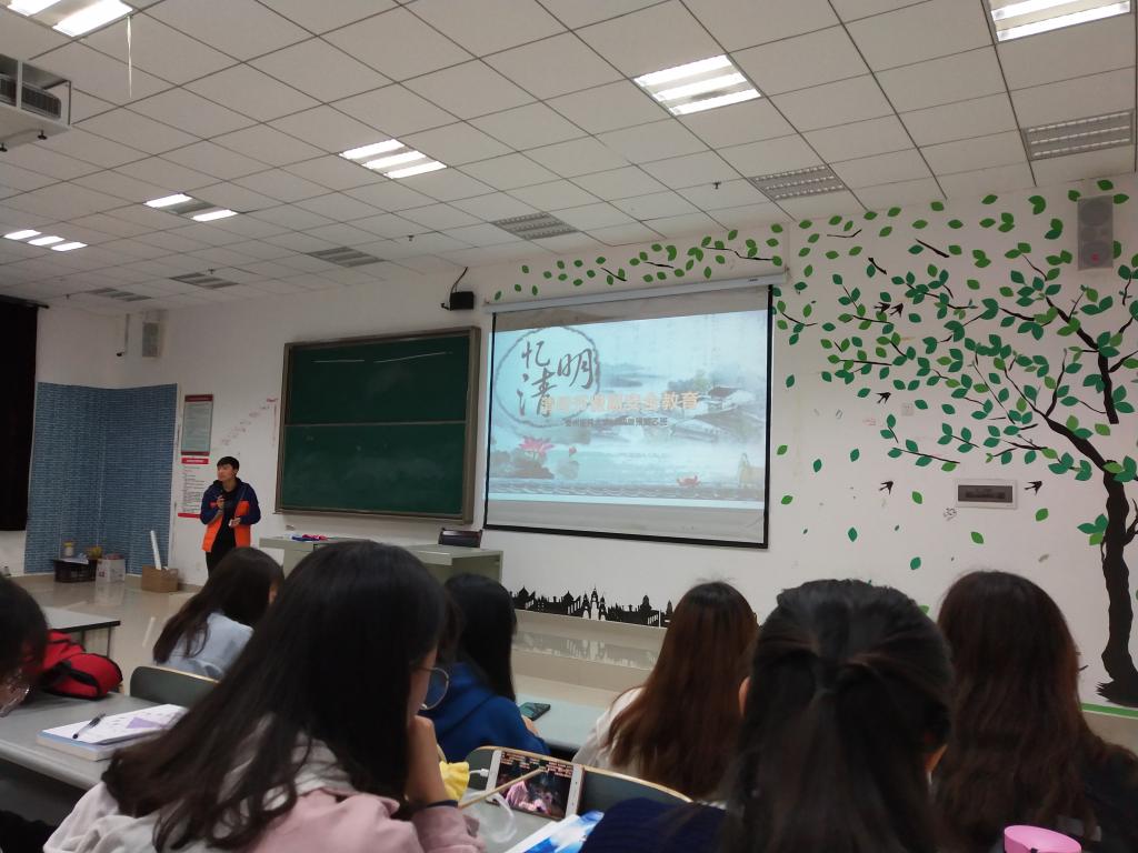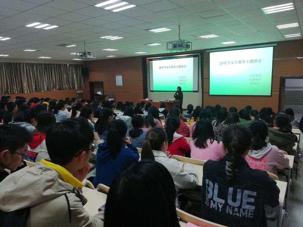 各年级主题班会上,辅导员分别向同学们介绍清明节的来源及文化内涵,倡导同学们采用科学文明的祭祀方式,用敬献鲜花、植树绿化等现代祭扫方式表达对先人的哀思、对先贤的怀念以及对先烈的崇敬。