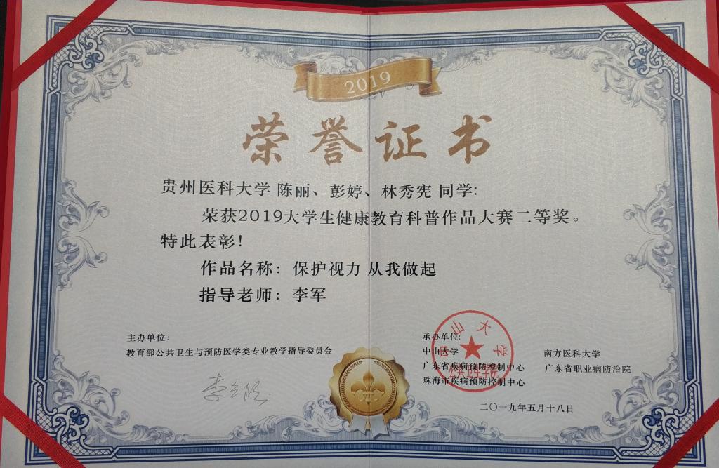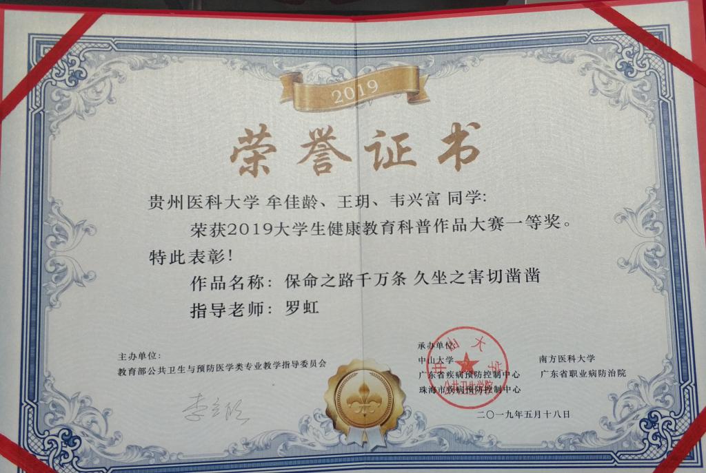 近日,由教育部公共卫生与预防医学类专业教育指导委员会主办,教育部公共卫生与预防医学类专业教学指导委员会主办,中山大学、南方医科大学、广东省疾病预防控制中心和广东省职业病防治院承办了“2019老员工健康教育科普作品大赛”评选结果揭晓,太阳成集团tyc122ccvip选送的2件员工创作作品在大赛中取得佳绩。由罗虹老师指导,牟佳龄、王玥、韦兴富同学创作的作品《保命之路千万条久坐之害切凿凿》获一等奖;李军老师指导,陈丽、彭婷、林秀宪同学创作的作品《保护视力从我做起》获二等奖。