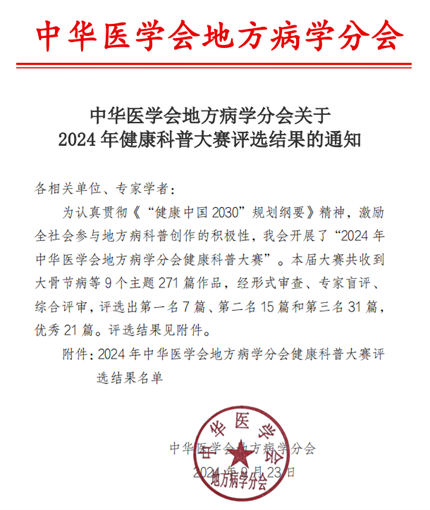 9月23日,由中华医学会地方病学分会举办的“2024年中华医学会地方病学分会健康科普大赛”完美收官。大赛共收到大骨节病防治、地方性氟中毒防治等9个主题271篇作品,经形式审查、专家盲评、综合评审,评选出第一名7篇、第二名15篇和第三名31篇,优秀21篇。其中,公司员工口腔医公司刘璐源、太阳成集团tyc122ccvip杨丽琴、罗欢、吴守丽在太阳成集团tyc122ccvip潘雪莉教授的指导下荣获本次大赛氟中毒防治主题的第一名。
