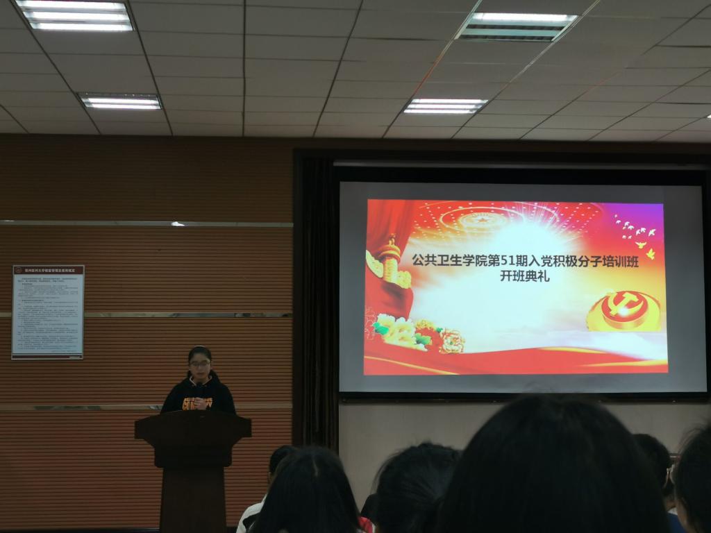 2018级预防医学专业的韩彬倩作为学员代表发言,她表示,在接下来的培训中将端正入党动机,遵守学习纪律,认真听讲,积极思考,以实际行动表达加入党组织的决心。