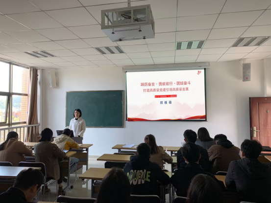 郑维薇以《踔厉奋发·勇毅前行·团结奋斗,打造高质量党建引领高质量发展》为题,深入浅出的阐述了党的二十大取得的重大政治成果、理论成果、实践成果,深入解读了党的二十大的重大意义,从过去5年的工作和新时代10年伟大变革、马克思主义中国化时代化、中国式现代化、全面建设社会主义现代化国家的目标任务等方面对党的二十大精神进行了全面阐释和系统讲解。大家要坚持以习近平新时代中国特色社会主义思想为指导,进一步提高政治站位,增强思想自觉、政治自觉和行动自觉,深入学习贯彻落实党的二十大精神,深刻领悟“两个确立”的决定性意义,自觉衷心拥护“两个确立”、忠诚践行“两个维护”,始终在思想上、政治上、行动上与党中央保持高度一致。随后,用全国劳模、“七一勋章”获得者等榜样人物的感人事迹,以榜样的力量引领带动全体师生党员积极践行党的二十大精神,切实把党的二十大精神转化为指导实践、推动工作的强大力量。