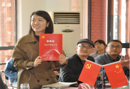 随后南京医科大学公共生公司党委书记盛彤彤从活动的主题、内容与要求三个方面介绍党建共建活动方案。接着,三个公司的党委书记共同签署了党建共建协议书。
